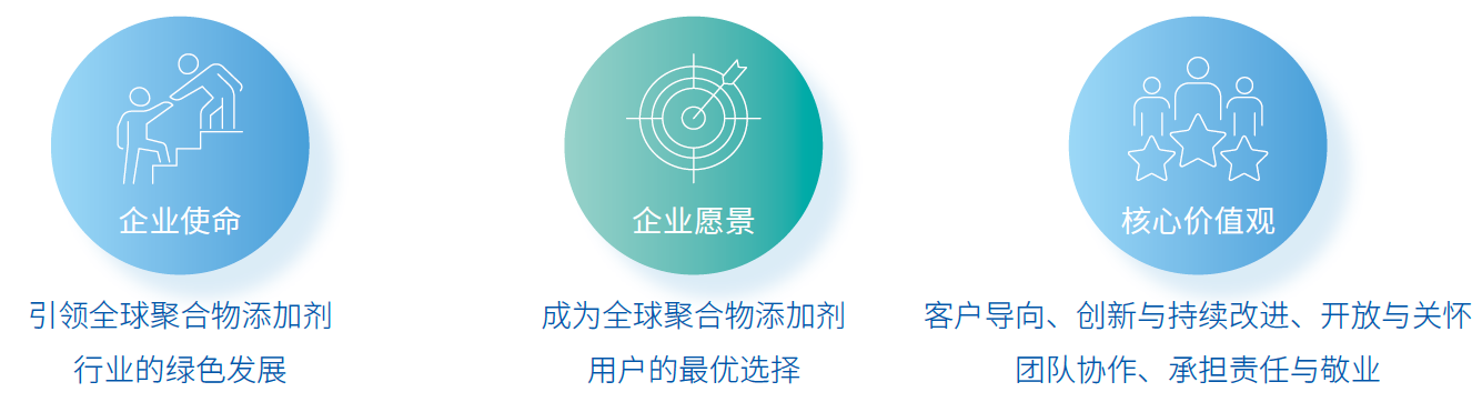 可持续发展已经成为全球共识,是激发科技创新,促进绿色发展,推动化工企业实现高质量发展的必然选择。圣奥化学秉承“客户导向、创新与持续改进、开放与关怀、团队协作、承担责任与敬业”的核心价值观和“极致、绿色”的创新发展观,通过积极构建以“Smart Sennics”为核心的数字化、智能化、服务化战略转型升级目标,以“引领全球聚合物添加剂行业的绿色可持续发展”为使命,全面落实“SCI-MAN+ 2030”倡议,向“成为全球聚合物添加剂用户的最优选择”的企业愿景持续迈进。
