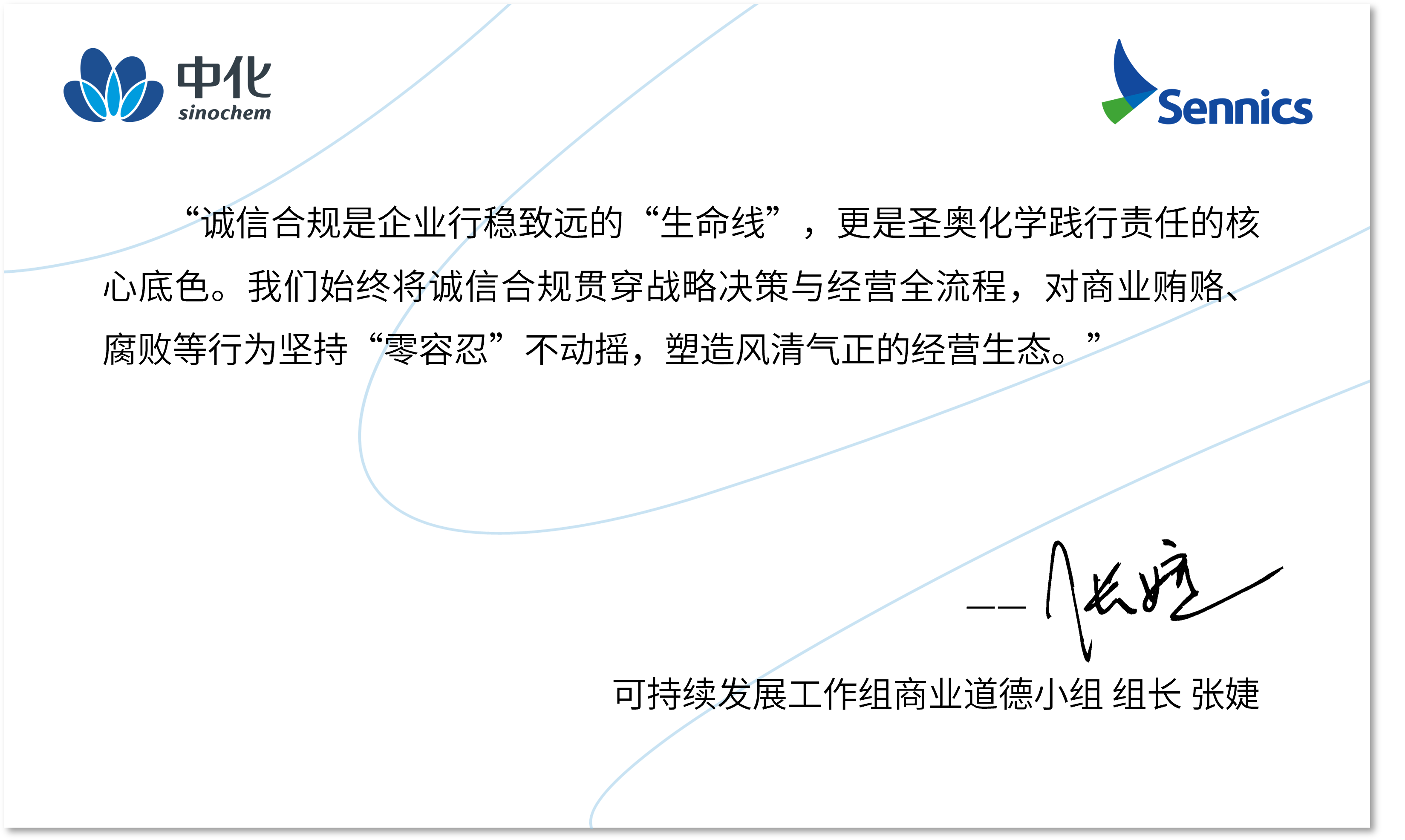 圣奥化学秉持“打造高精专化学品领域的全球领先企业”战略目标,将可持续发展理念与标准融入公司治理,致力于以高道德标准践行负责任的商业运营,确保业务符合所有运营地中有关公平竞争、反洗钱、反贿赂和反腐败的国际准则与法律法规。公司从守法合规、反腐败、数据安全及知识产权保护等各方面健全体制机制建设,由可持续发展工作组下商业道德小组(含法律合规与知识产权部、审计部、运营中心等)负责推进及落实相关工作,按照《中国中化诚信合规手册》《中国中化合规义务公约》《中国中化合规责任书》《中国中化反商业贿赂合规手册》等规范自身行为,持续提升全面风险管理水平,开展更为积极的沟通,以规范运营、透明管理赢得利益相关方的信赖与支持,为公司实现可持续发展奠定良好的治理基础,与合作伙伴共同建立相互尊重、相互信赖、公平交易的合作关系。
