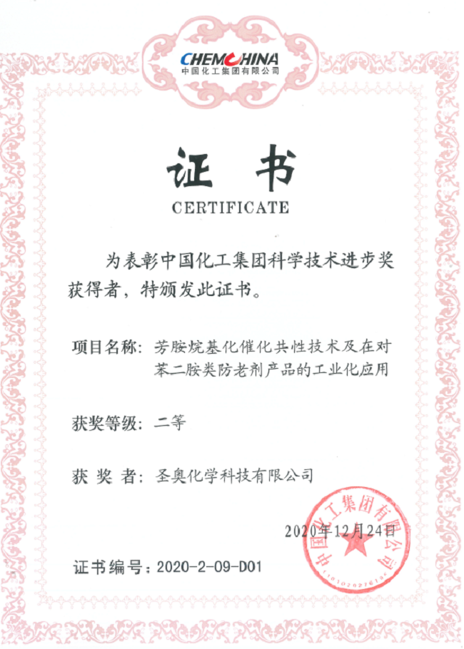 日前,圣奥化学“芳胺烷基化催化共性技术及在对苯二胺类防老剂产品的工业化应用”项目荣获2020年度中国化工集团科技进步奖二等奖。
