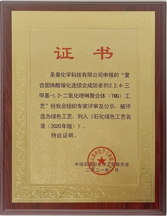 为推广先进绿色工艺技术在石油和化工行业的应用,进一步发挥《石化绿色工艺名录》对行业绿色发展的引导作用,1月15日,由中国石油和化学工业联合会编制的《石化绿色工艺名录(2020年版)》在京发布,圣奥化学复合固体酸催化连续合成2,2,4-三甲基-1,2-二氢化喹啉聚合体(TMQ)工艺被收录在内。