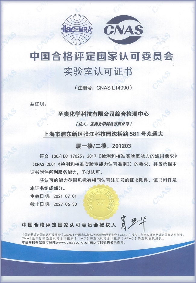 日前,圣奥化学综合检测中心通过中国合格评定国家认可委员会(英文缩写CNAS)认可,标志着圣奥化学综合检测中心具有国际及国家认可的管理水平和检测能力,这也是继泰安圣奥、山东圣奥、安徽圣奥检测中心分别于2018、2019和2020年获得CNAS认可后,圣奥化学旗下又一家检测中心通过此认可。