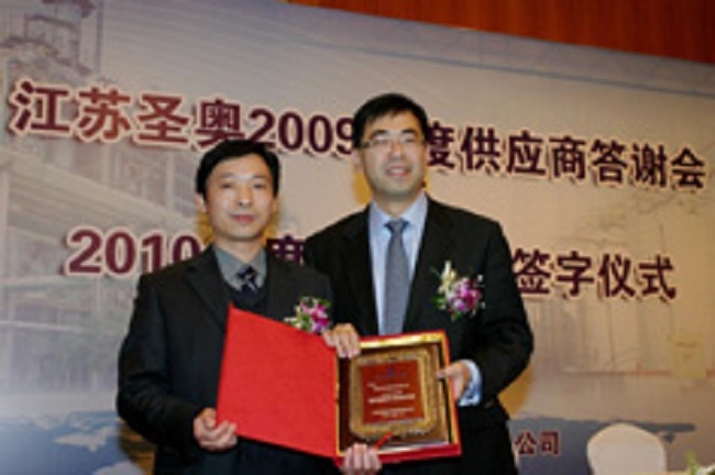 在各位领导精彩的致辞结束之后,大会还专门为2009年度优秀战略合作伙伴和供应商举行了隆重的颁奖仪式,共颁发了包括“2009年度优秀供应商”在内的7个奖项,对那些在提高产品质量及效率等方面有着突出贡献的供应商予以肯定。在随后举行的2010年度战略采购签字仪式上,蔡峥琦先生代表江苏圣奥与3家供应商签约,并表示各方将在供应链管理、技术创新等各个领域进行战略合作。江苏圣奥将在协议确定的框架内,积极推进与供应商们的深化合作,互动促进,在广泛的交流合作中,实现双方的优势互补、互相促进、共荣共赢,为双方的发展开辟广阔的前景。