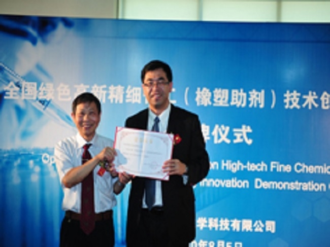 中国工程院院士李俊贤、中国化工学会精细化工专业委员会主任王大全、泰州市相关政府部门领导等嘉宾均出席了此次的挂牌仪式。在仪式上,王大全主任向江苏圣奥首席执行官兼首席财务官蔡峥琦颁发证书,正式授予江苏圣奥 “全国绿色高新精细化工(橡塑助剂)技术创新示范中心”的称号。
