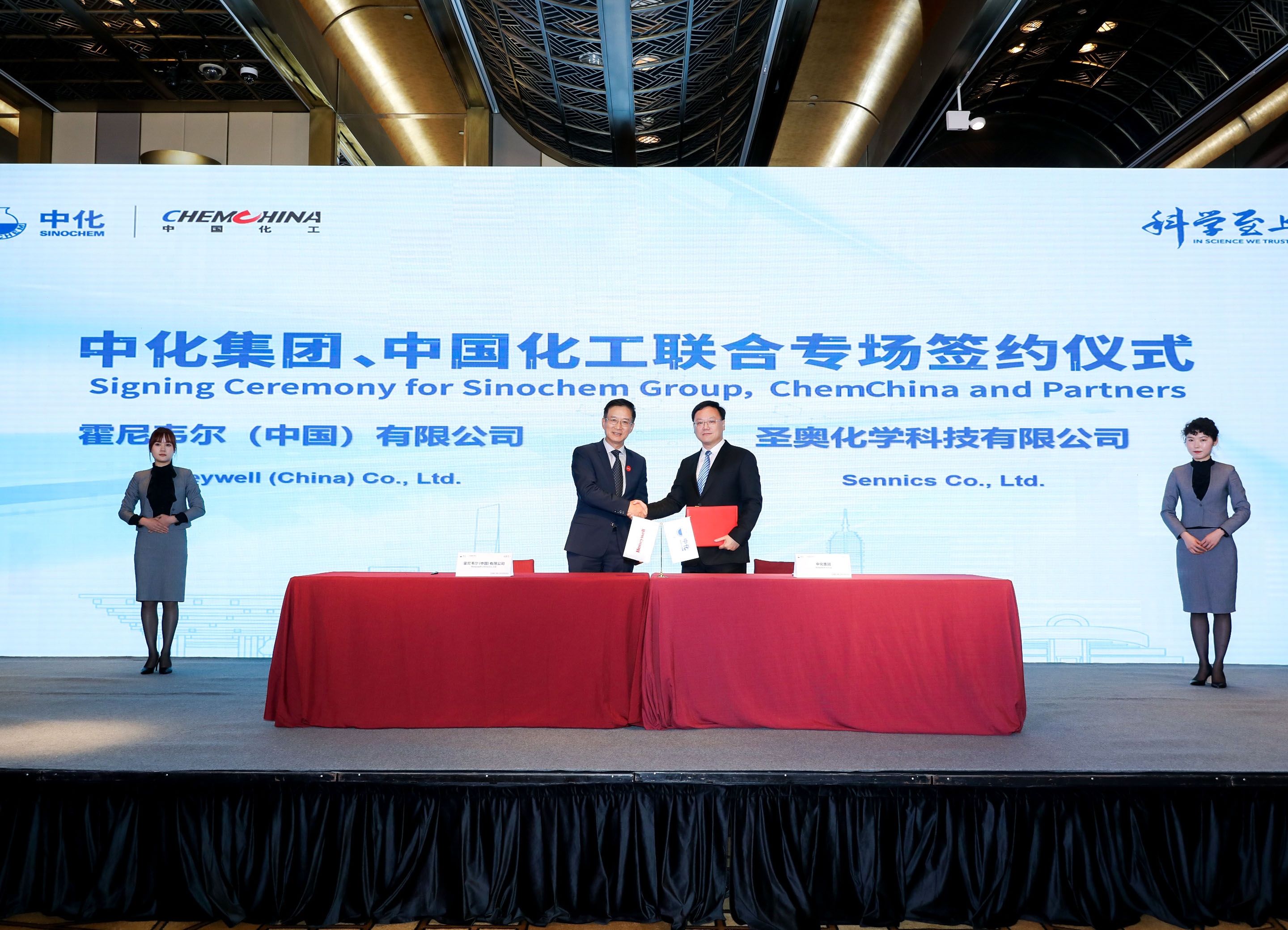 中化集团董事长宁高宁、中化集团副总经理阳世昊、中化国际总经理刘红生、中化国际副总经理,圣奥化学CEO苏赋、圣奥化学总裁助理唐闻雷、霍尼韦尔中国区总裁张宇峰、霍尼韦尔中国区业务拓展副总裁黄志明、霍尼韦尔过程控制部大中华区副总裁兼总经理陈延等领导出席签约仪式。