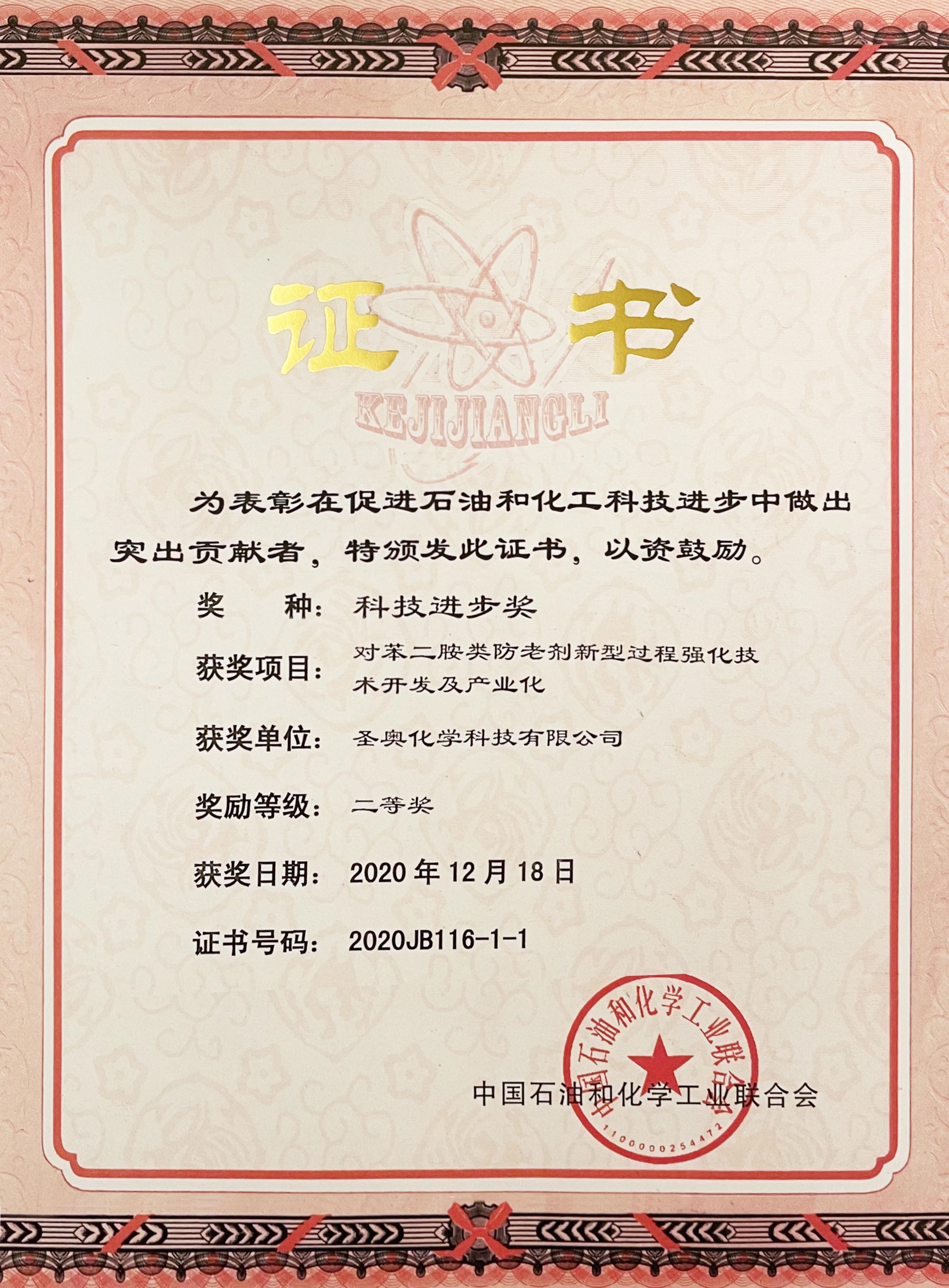 12月23-24日,由中国石油和化学工业联合会主办的全国石油和化工科技创新大会在杭州举行,会议期间表彰了2020年度石油和化工行业科技创新获奖单位。圣奥化学“对苯二胺类防老剂新型过程强化技术开发及产业化”项目荣获2020年度中国石油和化学工业联合会科技进步二等奖,并凭借在技术创新和知识产权等方面的优势,荣获2020年度中国石油和化工行业知识产权示范企业。