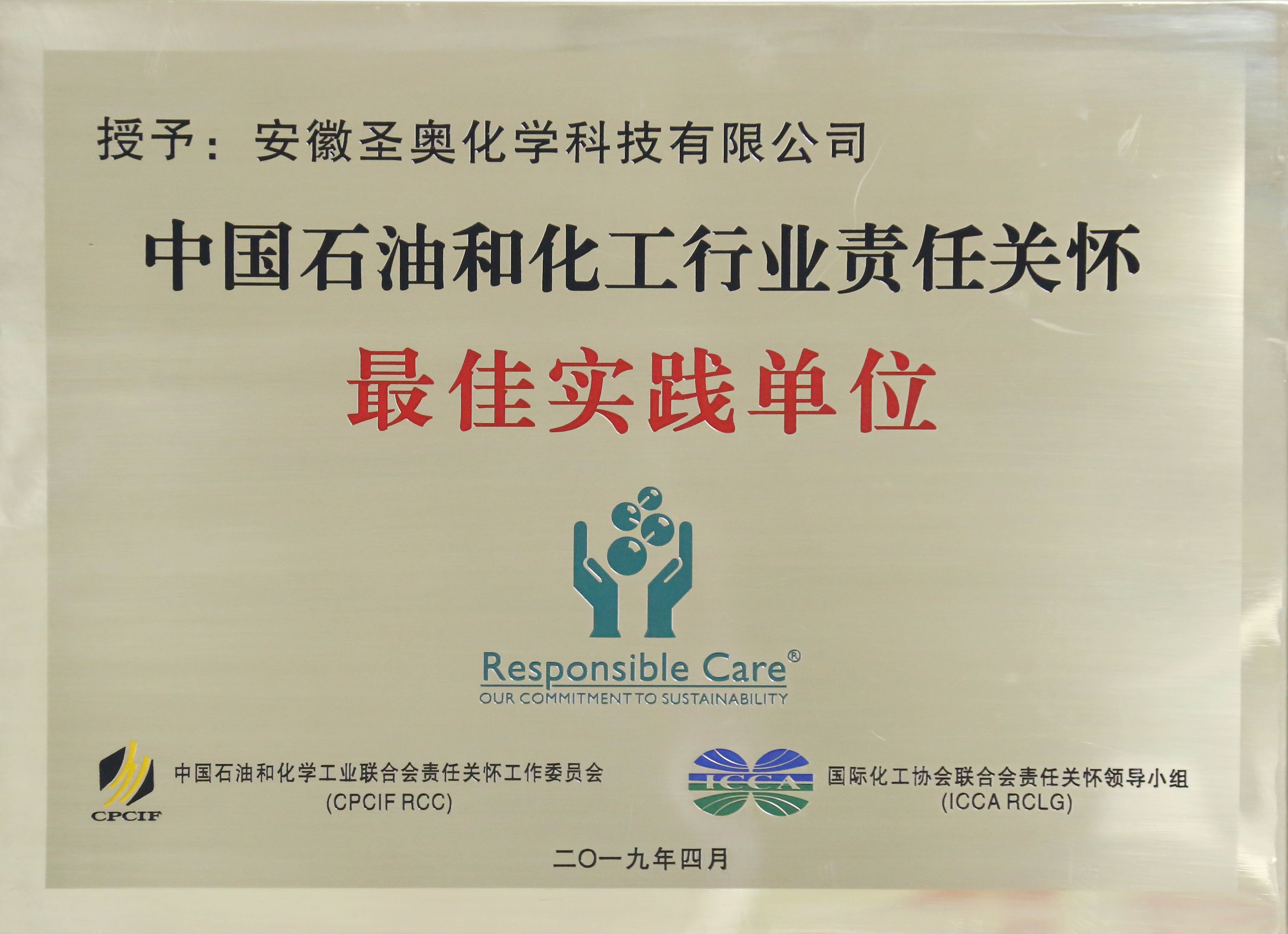 安徽圣奥荣获 “中国石油和化工行业责任关怀最佳实践单位”