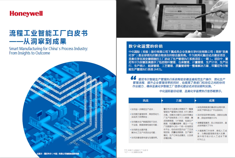 这份题为《流程工业智能工厂白皮书——从洞察到成果》的报告主要探讨了“智能工厂”的定义、智能制造的关键成功要素、智能制造领域最新技术趋势以及霍尼先进技术助力中国及全球用户取得成功的案例,圣奥化学作为其“数字化运营的价值”实际应用的一个成功智能工厂案例,与用户进行了分享。