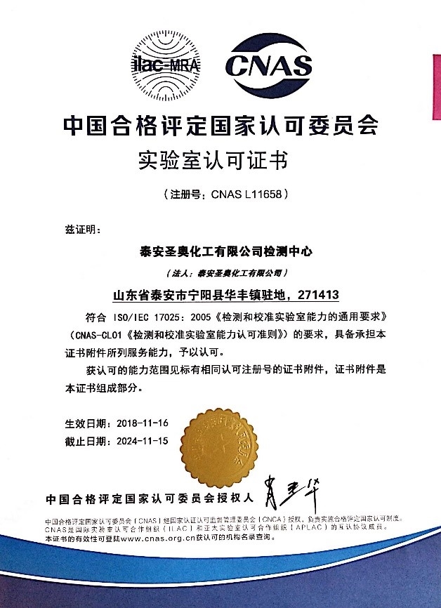 11月28日,泰安圣奥检测中心通过中国合格评定国家认可委员会(英文缩写CNAS)认可,这标志着泰安圣奥检测中心已经具有了国家及国际认可的管理水平和检测能力。