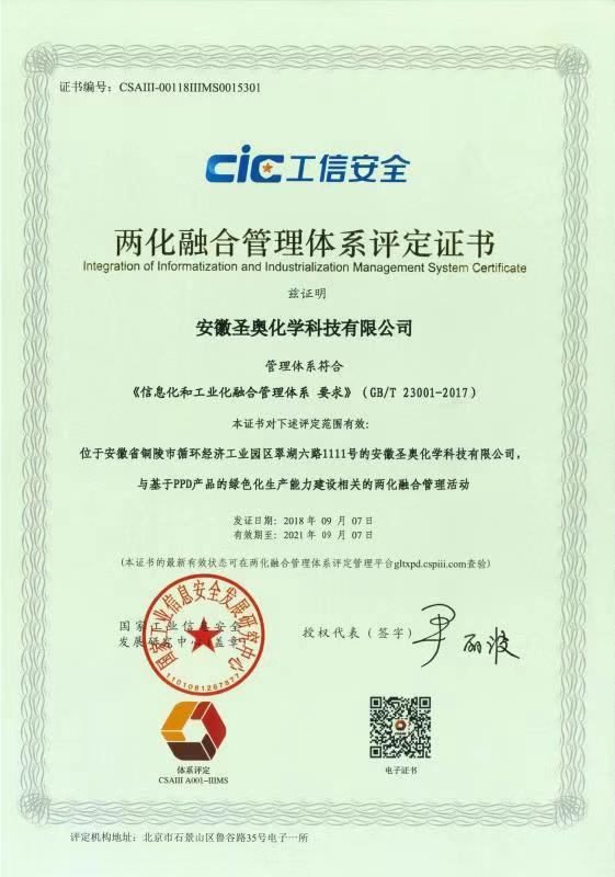 日前,安徽圣奥正式通过国家两化融合管理体系认证,标志着圣奥化学两化融合发展进入新阶段。