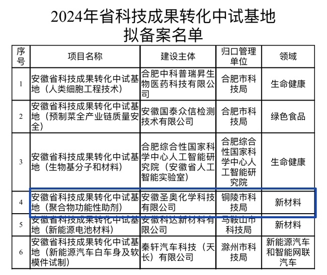 近日,安徽省科技厅发布《2024年安徽省科技成果转化中试基地拟备案名单》,安徽圣奥获批“安徽省科技成果转化中试基地(聚合物功能性助剂)”资质。
