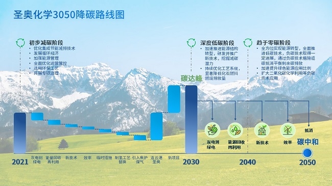 圣奥化学围绕碳中和目标宣布降碳时间表,“力争于2030年实现碳达峰,2050年实现碳中和”,通过三个阶段变革重塑发展模式,制定“2021-2030初步减碳,2030-2040深度低碳,2040-2050趋于零碳”的降碳路线图。