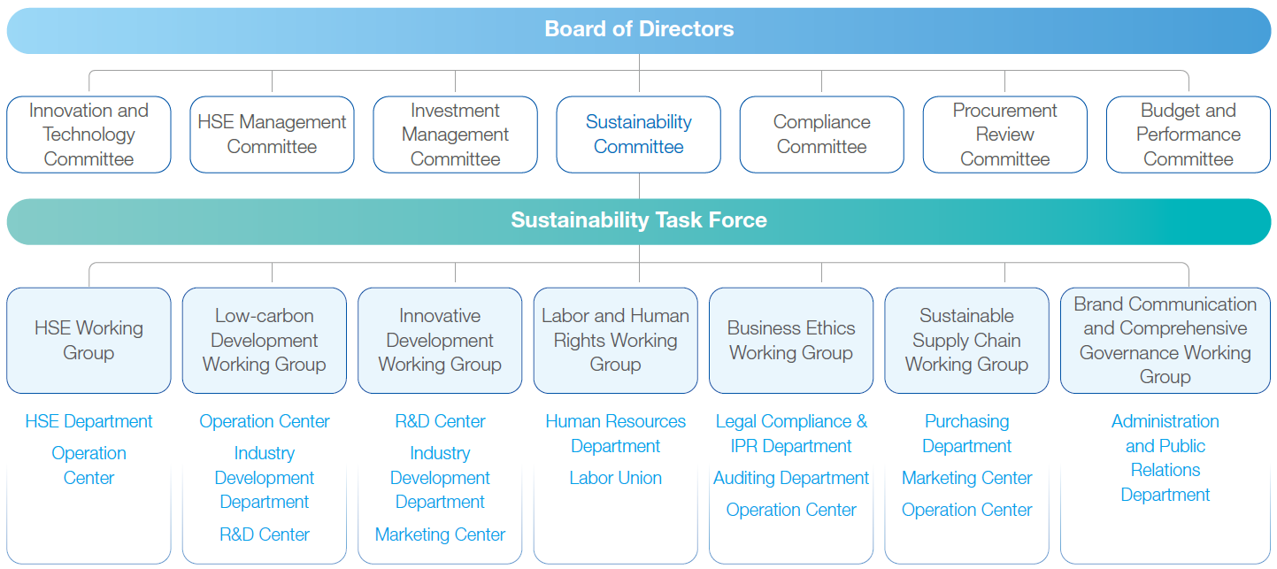 As the main entity responsible for the company's sustainability efforts, the Sustainability Committee is responsible for reviewing the overall strategy, objectives, overall planning, and performance of sustainability work. The Sustainability Task Force led by Vice President of Sennics was established under the Committee, and its members include leaders of relevant departments. There are seven working groups under the Sustainability Task Force, namely Health, Safety, Environmental Protection and Quality (HSEQ), Low-carbon Development, Innovative Development, Labor and Human Rights, Business Ethics, Sustainable Supply Chain, Brand Communication and Comprehensive Governance, including HSE Department, Operation Center, Industry Development Department, R&D Center, Marketing Center, Human Resources Department, Labor Union, Legal Compliance & IPR Department, Auditing Department, Purchasing Department, Administration and Public Relations Department and other functional departments. They not only carry out responsible for dealing with specific sustainability matters of Sennics, but also review specific issues, sustainable development policies and progress against the related goals every year.