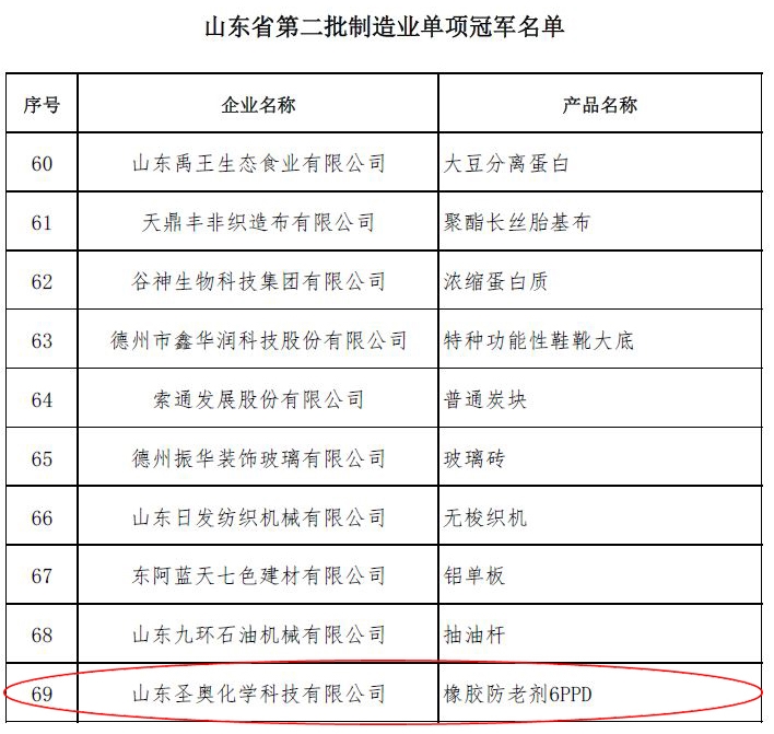 The Department of Industry and Information Technology of Shandong Province announced the list of the second batch of champions in the local manufacturing industry, and Sennics Shandong successfully made the list with its rubber antioxidant 6PPD, which is not only a high recognition of Sennics' product quality, technical strength and market reputation, but also a great spur to its innovation and development. With the mission of "Leading through Green Innovation", Sennics Shandong will further accelerate its transformation and upgrading, consolidate its ability of independent innovation, and make contributions to the development of the industry and regional progress. It is reported that the selection is aimed at guiding manufacturing enterprises to focus on innovation and quality improvement, cultivate champions in more product segments, and then enhance the competitiveness of the manufacturing industry and enable it to move towards the mid- to high-end production. The selection was organized by Shandong Economy and Information Technology Committee and Shandong Industrial Economy Federation. Enterprises on the list are all taking a leading position and representing the highest level in their respective field in the manufacturing industry of Shandong Province. For the shortlisted enterprises, relevant departments will provide them with better services, support and guidance, so as to help them achieve further development as they have core competitiveness and market discourse power, and can act as a role model in the manufacturing industry.