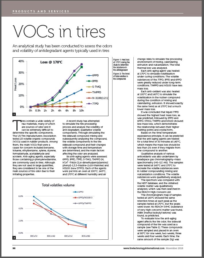 At the same time, a series of excellent speeches, forums and seminars were held at the exposition, involving the topics of tire design, tire manufacturing technology, tire performance development and progress. Sennics delivered a keynote speech titled "Volatile Substances of Antioxidants and Tire Odor", introducing the odor sources of automobiles tires and the control measures for the main volatile substances produced in the process of tire compound processing. It demonstrated the company's innovation and R&D capabilities, and showed its firm determination to take the road of green operation, environmental protection and sustainable development, which received wide attention and praise from customers. VOCs in Tires is also included in the English magazine of the exhibition called 2018 Tire Technology International.