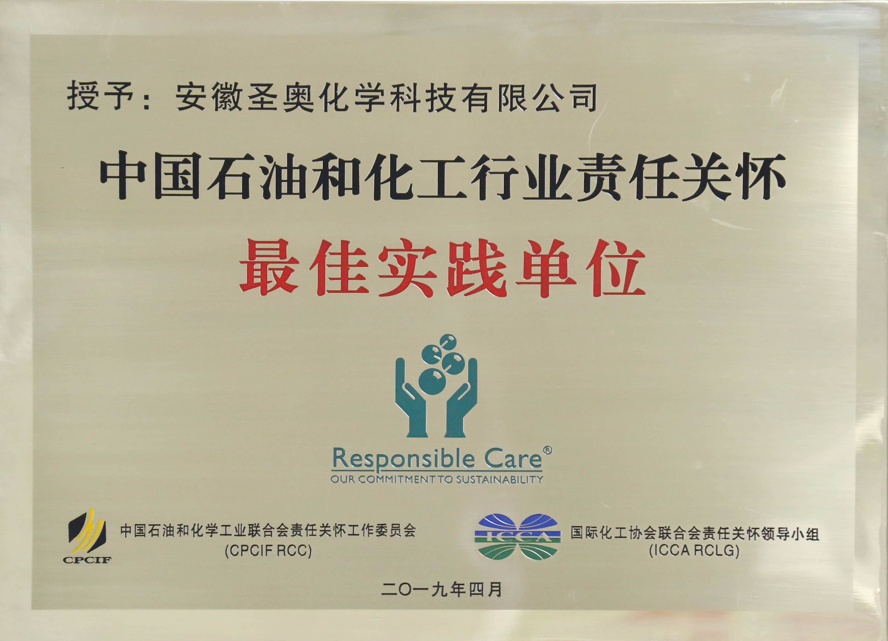 On April 19,Sennics Anhui was awarded the "Best Practice Unit of Responsible Care in China's Petroleum and Chemical Industry".